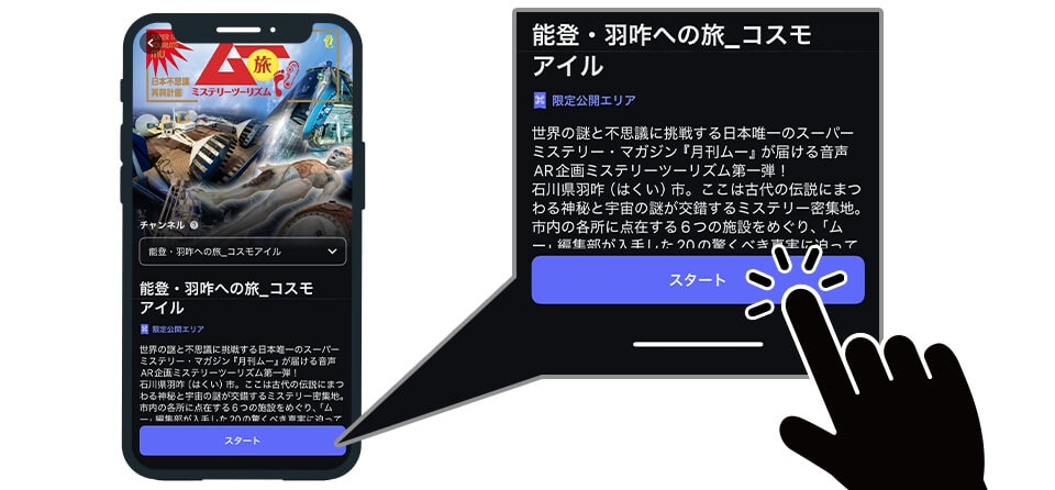 入館チケットを購入し、限定QRコードの読み込み&スマホに音声ARアプリ「SARF」をインストールして参加完了! アプリに表示される案内にそって市内の名所をめぐると、ムー的解説を聞くことができます。全ポイント制覇したあなたには、特別なプレゼントも!